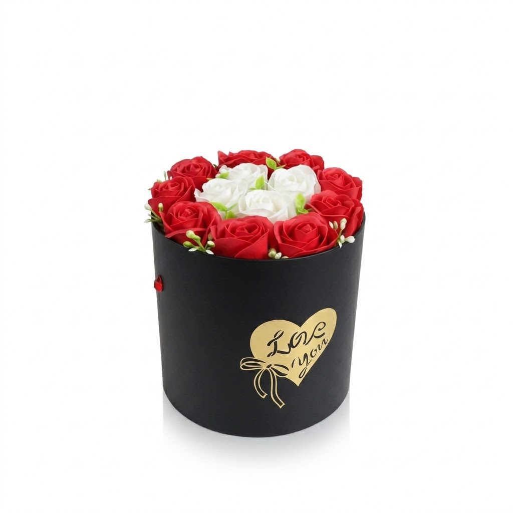 Acest aranjament sofisticat este mai mult decât un simplu cadou; este o declarație de afecțiune care nu se estompează niciodată. Prezentat într-o cutie cilindrică neagră, mată, decorată cu un mesaj auriu „Love You”, acest mix de trandafiri din mătase roșii și albi emană eleganță și rafinament.
