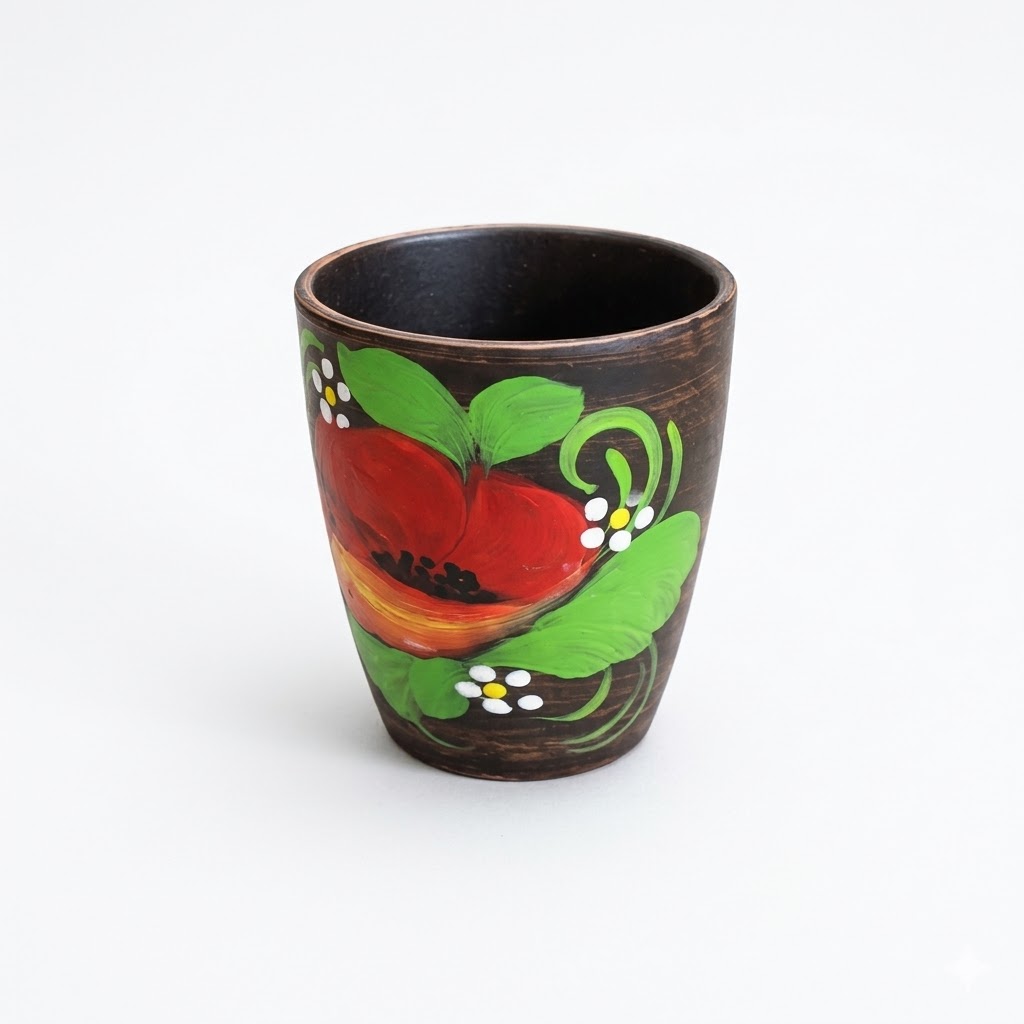 Pahar Tradițional din Ceramică, Pictat Manual – Motiv Floral (Mac Roșu)