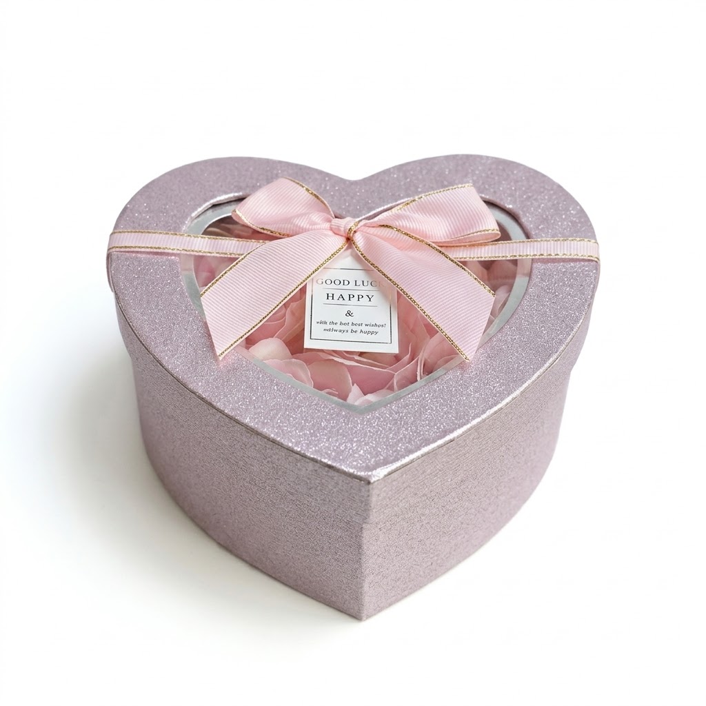 Exteriorul cutiei este acoperit cu un strat fin de sclipici roz care captează lumina discret, în timp ce capacul prezintă o fereastră transparentă ce dezvăluie un interior delicat. Spre deosebire de florile de săpun obișnuite, acest aranjament conține trandafiri realizați din material textil (mătase premium), oferind un aspect vizual mult mai realist și o durabilitate superioară în timp.