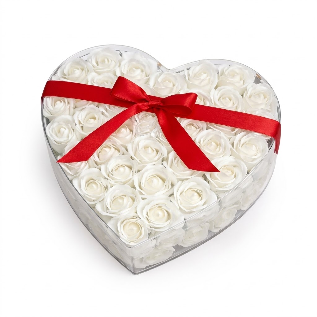 Aranjament Floral Inimă – Cutie Transparentă cu Trandafiri de Mătase Albi și Fundă Roșie