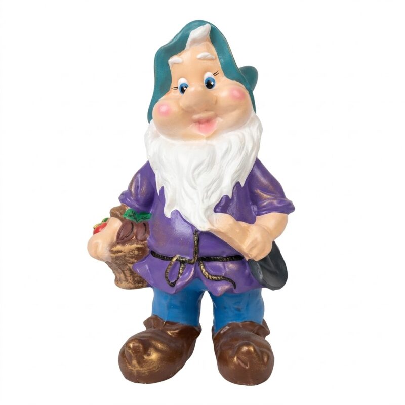 Transformă-ți grădina, terasa sau curtea din față într-un spațiu de poveste cu acest pitic de grădină de dimensiuni impresionante. La cei 75 de centimetri ai săi, această decorațiune nu este un simplu detaliu, ci un adevărat centru de interes vizual care va da personalitate întregului aranjament peisagistic. Cu haina sa mov vibrantă, pălăria turcoaz și detaliile atent lucrate (precum coșul cu recoltă și cizmele cu aspect de bronz), statueta îmbină perfect stilul clasic cu un design plin de viață.