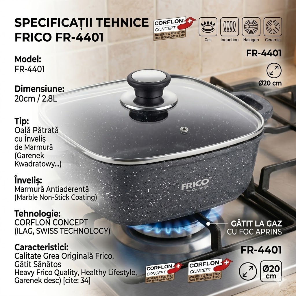 Oală pătrată FRICO FR-4401 cu înveliș de marmură antiaderentă, inducție, 20 cm, 2.8L Oală pătrată FRICO FR-4401 cu înveliș de marmură antiaderentă, inducție, 20 cm, 2.8L