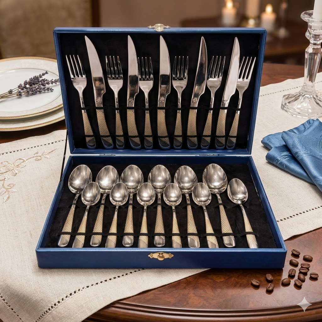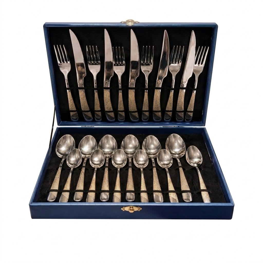 Set tacâmuri inox premium 24 piese cu cutie albastră elegantă