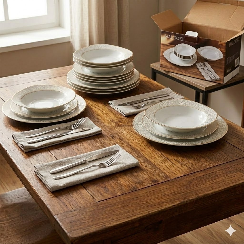Transformă fiecare cină într-o experiență de neuitat! Setul de masă Malooki a fost creat pentru a aduce un plus de stil și bun gust în bucătăria ta. Designul său atemporal, cu margini decorate subtil, pune în valoare orice preparat culinar.