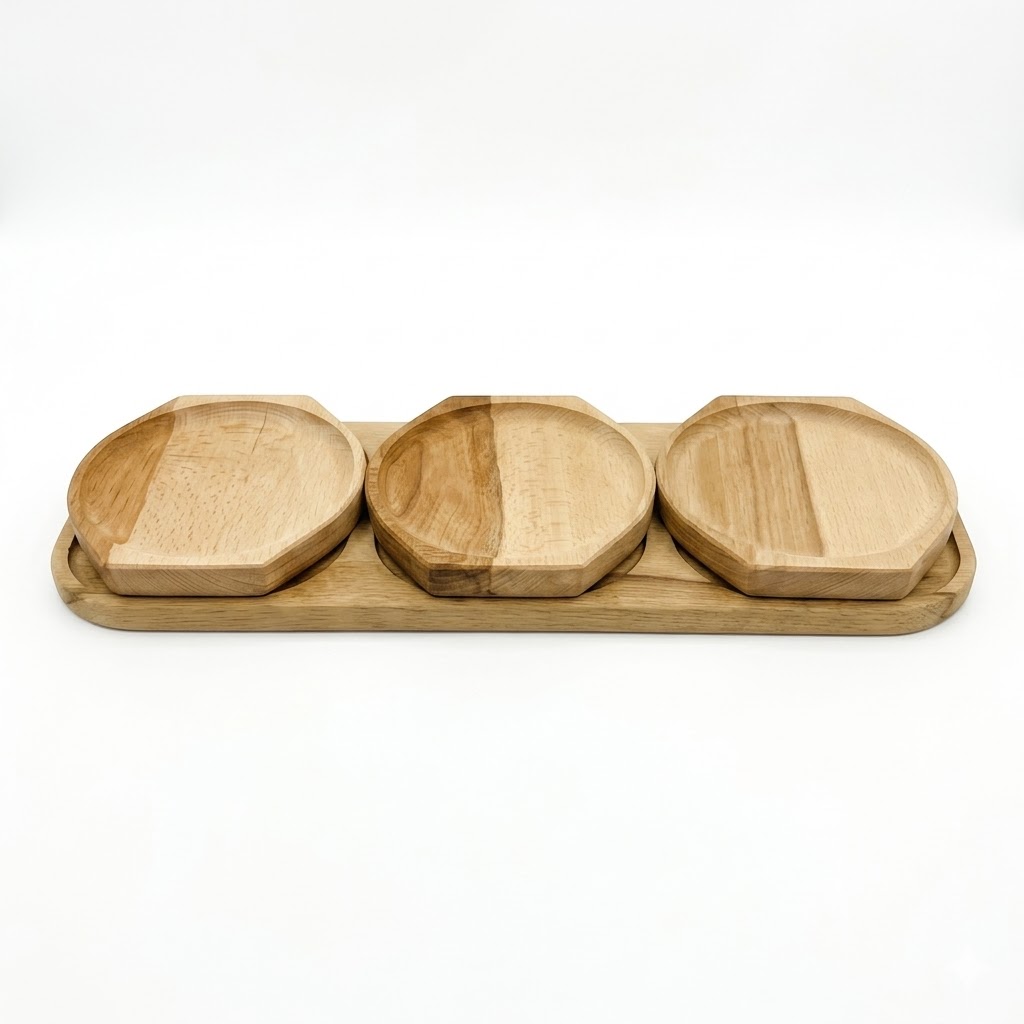 Piesa centrală a oricărei mese festive Dacă ești în căutarea unui suport de servire care să atragă toate privirile, acest platou din lemn masiv este alegerea perfectă. Cu o lungime generoasă de 75 de centimetri, oferă spațiu abundent pentru a crea platouri spectaculoase. Cele trei boluri mari, cu design geometric rotunjit, se încadrează perfect în decupajele tăvii, dar pot fi folosite și independent, oferindu-ți libertate totală în aranjarea mesei.