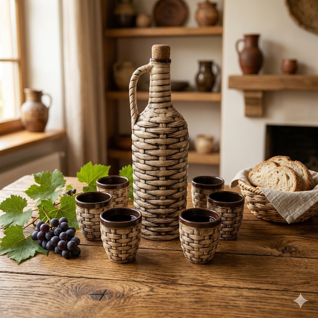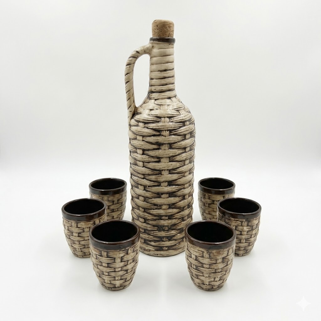 Set Rustic din Ceramică „Împletitură Rustica” – Sticlă cu Dop de Plută și 6 Cănițe